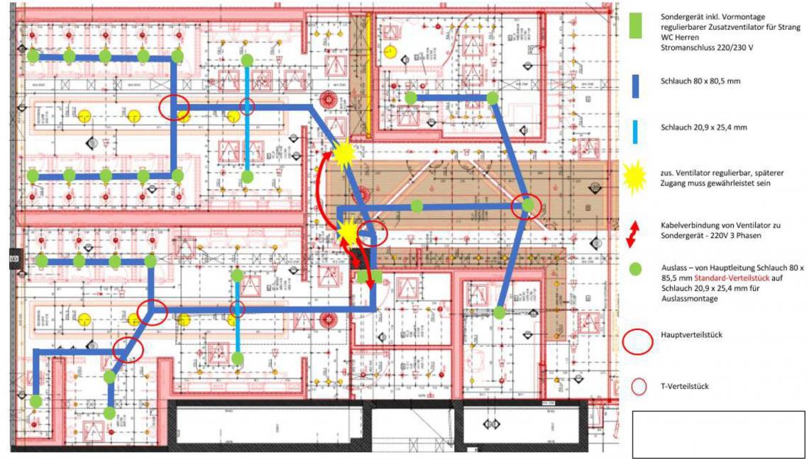 Beispiel Planung Toilettenbereich - Eliminierung negativer Gerüche - dezente Beduftung Da über die abgehängte Decke gearbeitet werden kann, wird jede Toilette mit einem Auslass bestückt. Der Toilettenbereich kann flächendeckend bespielt werden. Negative Gerüche werden an den Entstehungspunkten abgefangen